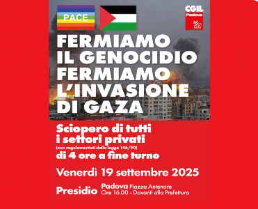In risposta alla grave situazione a Gaza, la Cgil Nazionale ha indetto una giornata di mobilitazione e sciopero nazionale per venerdì 19 settembre 2025. A Padova, la Cgil organizza un presidio – aperto a tutta la cittadinanza, alle associazioni e alla società civile – che si terrà in Piazza Antenore, davanti alla Prefettura, alle ore 16:00.