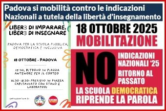 Anche a Padova, come in molte altre città (attualmente sono circa 40), sabato 18 ottobre il mondo della scuola e tutte le sue componenti (bambinɜ, ragazzɜ, insegnanti, genitori, personale di collaborazione, associazioni del Terzo Settore) prenderanno la parola per dire NO! ALLE INDICAZIONI NAZIONALI 2025 e un fortissimo SÌ! per la scuola pubblica, democratica, ispirata dai princìpi della Costituzione.
