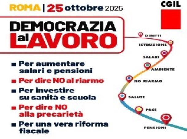 Per aumentare salari e pensioni, Per dire NO al riarmo, Per investire su sanità e scuola, Per dire NO alla precarietà, Per una vera riforma fiscale. Concentramento a P.zza della Repubblica, ore 13:30; conclusione a P.zza San Giovanni in Laterano