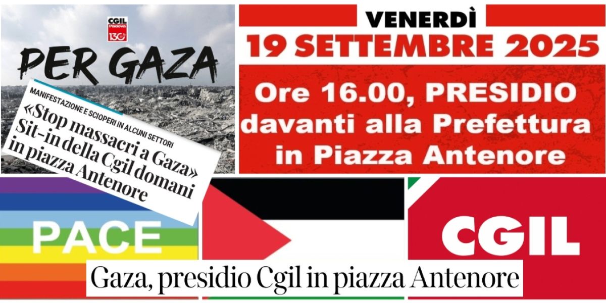 In risposta alla grave situazione a Gaza, la Cgil Nazionale ha indetto una giornata di mobilitazione e sciopero nazionale per venerdì 19 settembre 2025. A Padova, la Cgil organizza un presidio – aperto a tutta la cittadinanza, alle associazioni e alla società civile – che si terrà in Piazza Antenore, davanti alla Prefettura, alle ore 16:00.