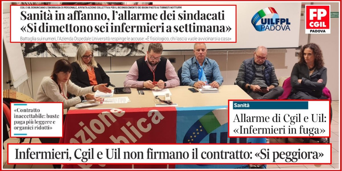 Infine i Segretari Generali di Fp Cgil Padova e Uil Fpl Padova hanno denunciato una grave perdita di attrattiva della professione infermieristica: “Stiamo assistendo al crollo delle Iscrizioni nei corsi di Scienze Infermieristiche: elle Università di Padova e Verona, quest'anno si è registrata una diminuzione del 40% con un tasso di abbandono degli studi che rimane molto alto. Tutto ciò non lascia spazio a nessun ottimismo: se la situazione non cambierà, entro il 2029 il saldo sarà negativo e la carenza di professionisti si farà ancora più critica”.