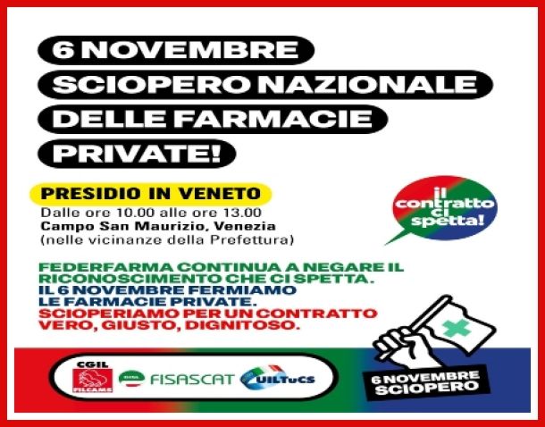 Domani, giovedì 6 novembre 2025, farmaciste e farmacisti veneti del settore privato incroceranno le braccia per l’intero turno di lavoro, a sostegno del rinnovo del Contratto Collettivo Nazionale di Lavoro, scaduto il 31 agosto 2024.