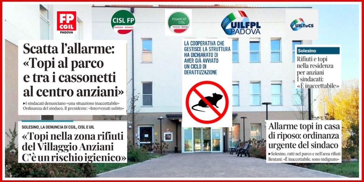 Le Segreterie Provinciali di Padova di Fp Cgil, Cisl Fp, Cisl Fisascat, Uil Fpl e Uil TuCS denunciano l'incredibile e non più accettabile situazione di rischio igienico-sanitario che si protrae da mesi presso la Residenza Villaggio Anziani tra noi – Papa Giovanni XXIII di Solesino (PD) gestito dalla Cooperativa Codess Sociale, in particolare nell'Area conferimento rifiuti e nelle zone limitrofe alla struttura, che risulta da parecchi mesi infestata da numerosi topi di grosse dimensioni.