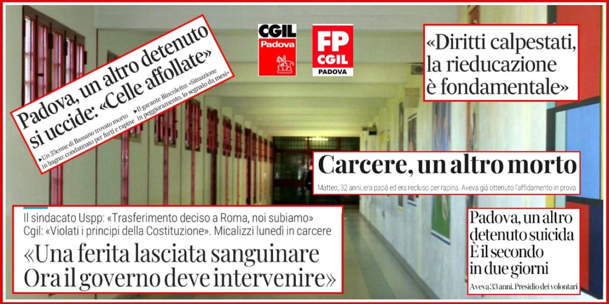 “La drammatica notizia del secondo suicidio in soli tre giorni all'interno della Casa di Reclusione Due Palazzi di Padova – dichiarano in una nota congiunta Cgil Padova e Fp Cgil Padova – scuote profondamente la comunità e mette a nudo le criticità strutturali del sistema giustizia. E quel che vediamo è una ferita aperta lasciata sanguinare da troppo tempo con gravi rischi di infezione. Una situazione che interroga le istituzioni sulla reale tenuta del modello detentivo e sul rispetto dei diritti umani fondamentali”.