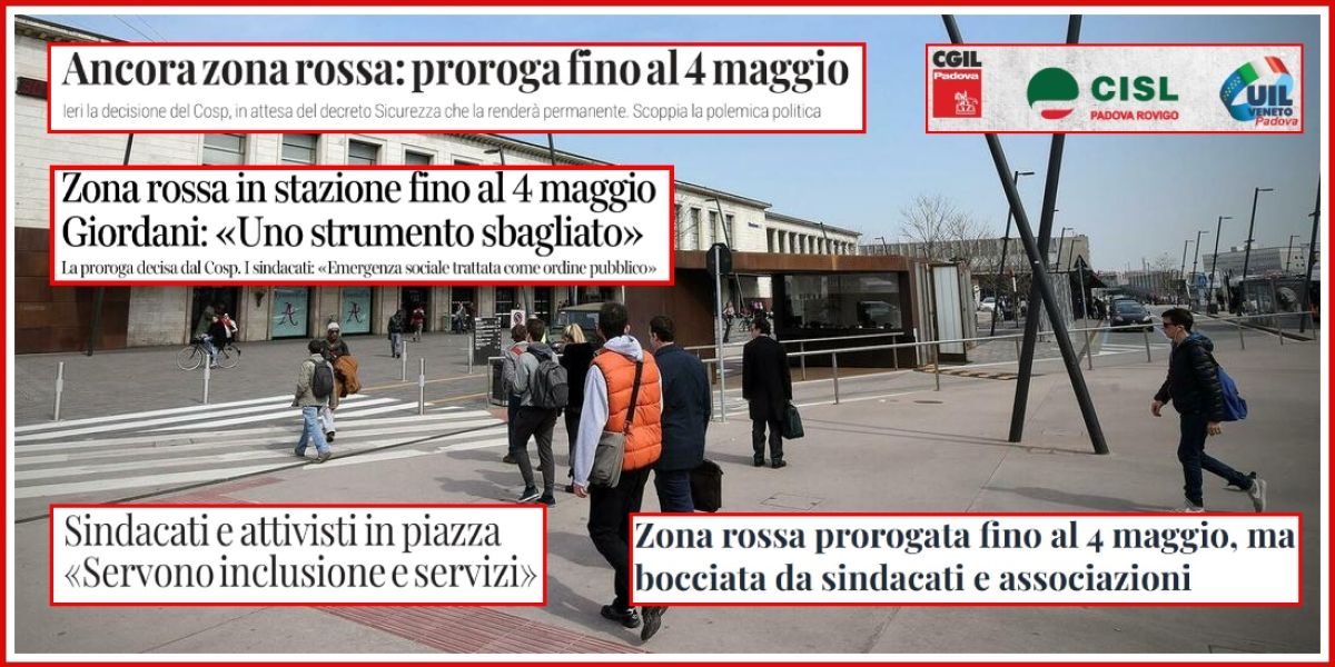 In vista della scadenza del provvedimento prevista per oggi, giovedì 19 febbraio, e della decisione di ieri della Prefettura di rinnovare la cosiddetta Zona Rossa nel quadrante della stazione ferroviaria fino al prossimo maggio, i Segretari Generali di Cgil Padova, Gianluca Badoer, Cisl Padova e Rovigo, Samuel Scavazzin e Uil Padova, Massimo Zanetti, hanno manifestato la propria totale contrarietà a una misura che giudicano tanto inefficace quanto ideologica.