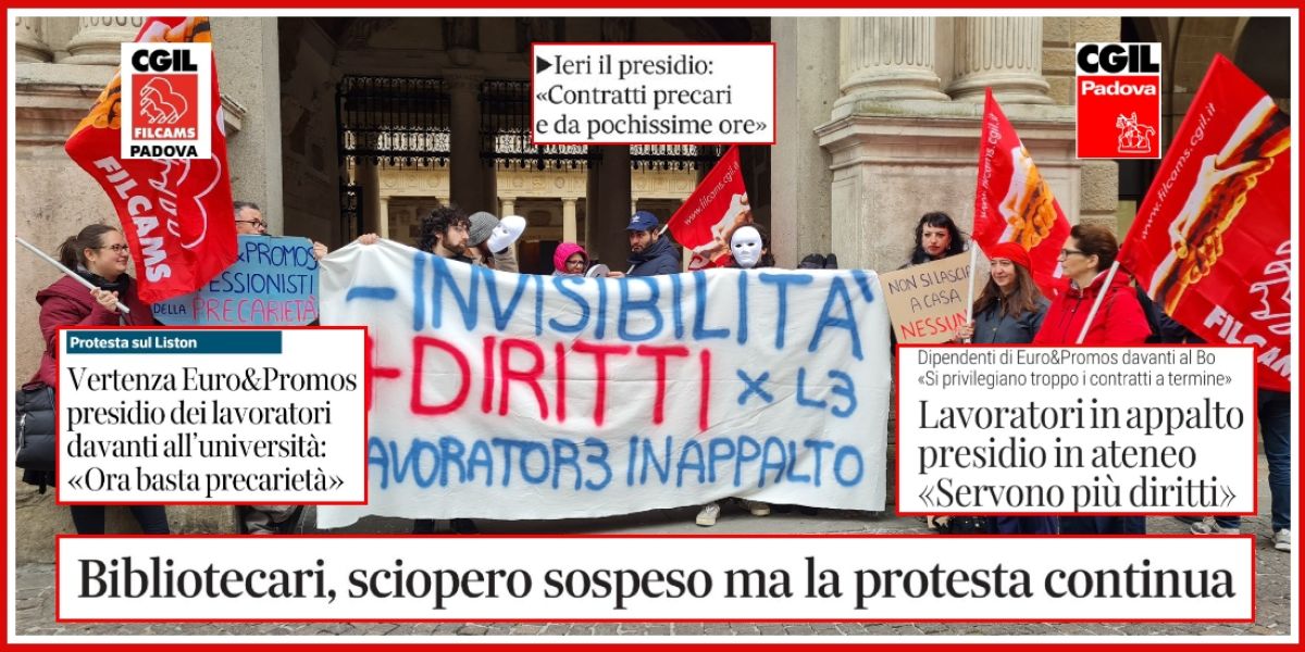 Ieri mattina, mercoledì 18 marzo, davanti al Palazzo del Bo’, sede dell’Università di Padova, le lavoratrici e i lavoratori di Euro&Promos FM Spa – l’azienda che gestisce i servizi di supporto nelle aule e nelle biblioteche per l’Ateneo – sono tornati a manifestare la loro esasperazione, dopo che già circa poco più di un anno fa (nel dicembre del 2024) lo avevano fatto, ottenendo allora un miglioramento delle loro condizioni che però non ha retto alla prova del tempo. Da qui, il ritorno allo stato di agitazione. Una protesta simbolica, quella di ieri, segnata dall’uso di maschere bianche per denunciare una condizione di "invisibilità" contrattuale e proteggere chi, essendo precario, teme ritorsioni. Inizialmente la mobilitazione prevedeva la proclamazione dello sciopero, ma l’azienda ha interpellato la Commissione di Garanzia. Per questo motivo la Filcams Cgil Padova, a tutela del personale e non avendo il tempo materiale di discuterne nel merito, ha deciso di sospendere l’astensione dal lavoro mantenendo però il presidio. Si tratta di una questione che il sindacato intende approfondire nelle sedi opportune, per salvaguardare non solo i diritti delle lavoratrici e lavoratori, ma la stessa agibilità del diritto di sciopero.
