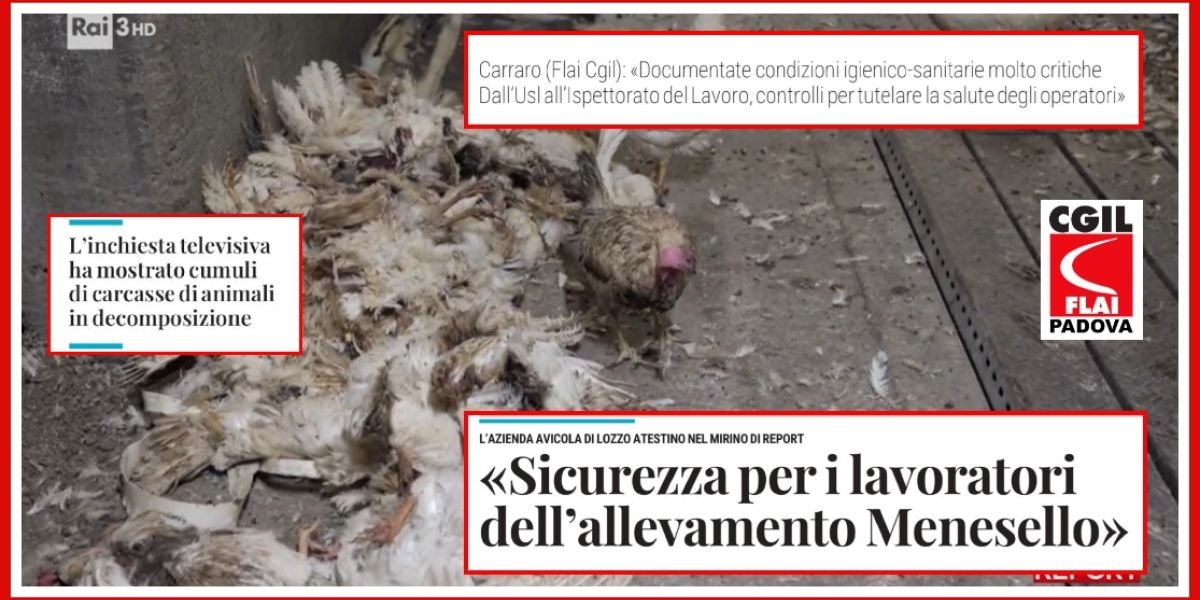 Alla luce dei fatti emersi dall’inchiesta giornalistica di Report, la Flai Cgil Padova esprime profondo sconcerto per la denuncia riguardo la grave situazione di degrado documentata all’interno dell’azienda avicola Menesello di Lozzo Atestino. “L’indagine – spiega il Segretario Generale della Flai Cgil Padova, Giuliano Carraro – ha mostrato condizioni igienico-sanitarie estremamente critiche, caratterizzate dalla presenza di carcasse di animali, accumuli di liquami, carenze nelle misure di biosicurezza e ambienti di lavoro potenzialmente pericolosi. Una situazione di tale gravità non riguarda esclusivamente il benessere animale, ma configura una vera e propria emergenza per la salute e la sicurezza delle lavoratrici e dei lavoratori impiegati nell’azienda”.